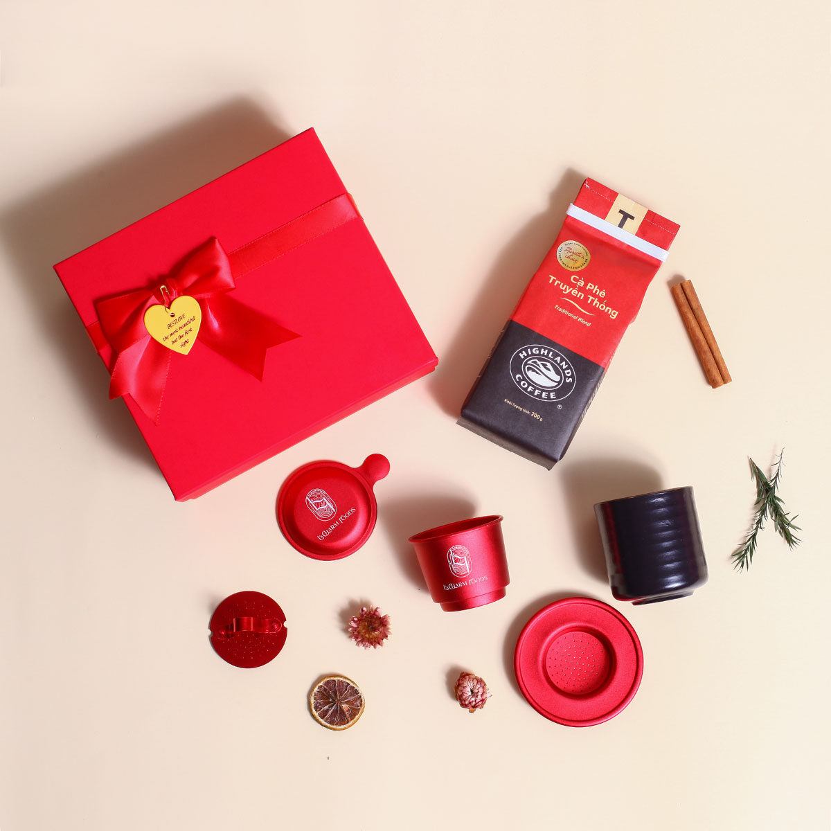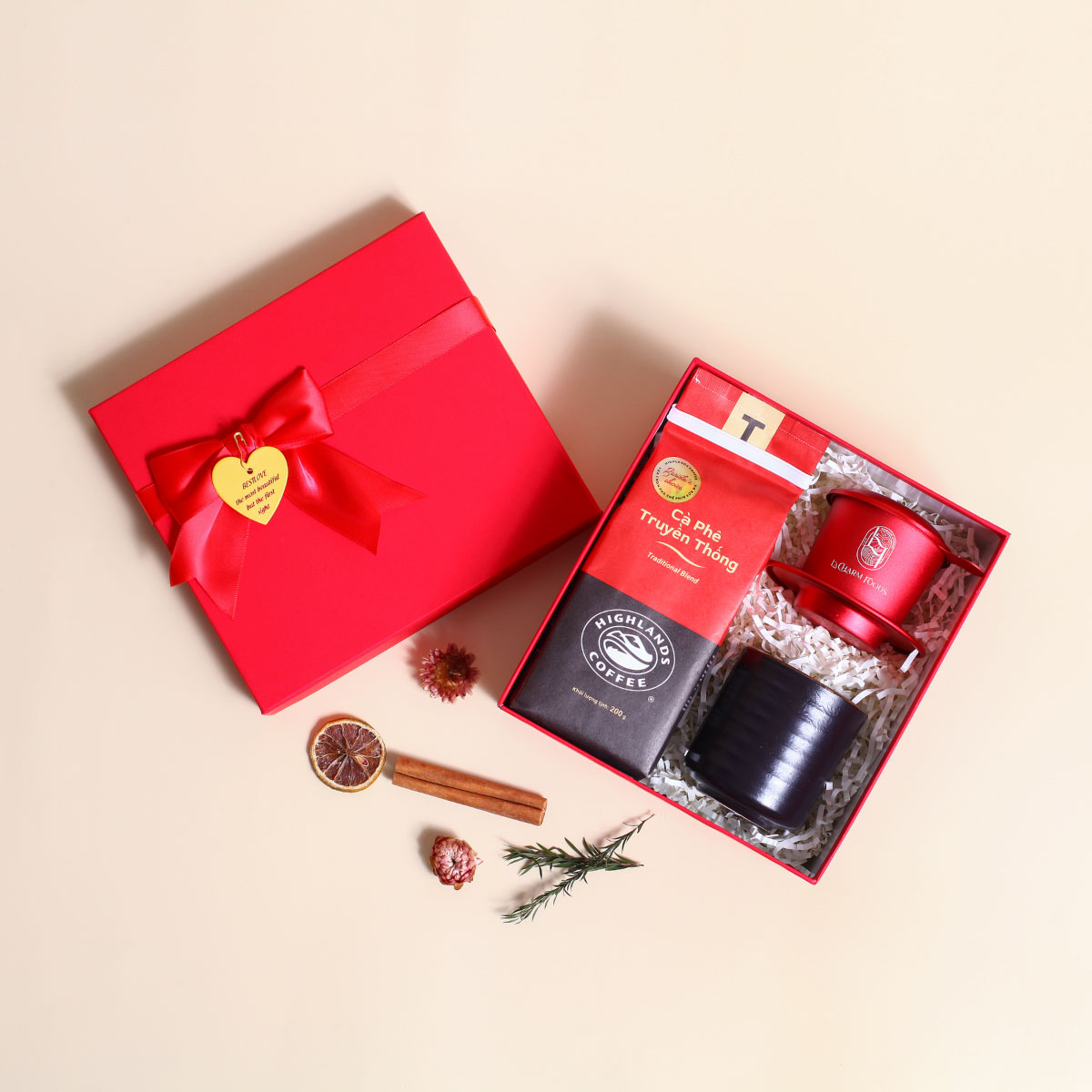 Phin Cà Phê 1 bộ | Coffee Highlands 200g | Ly Gốm Sứ 1 ly | Hộp Quà Cao Cấp và Túi Xách Sang Trọng