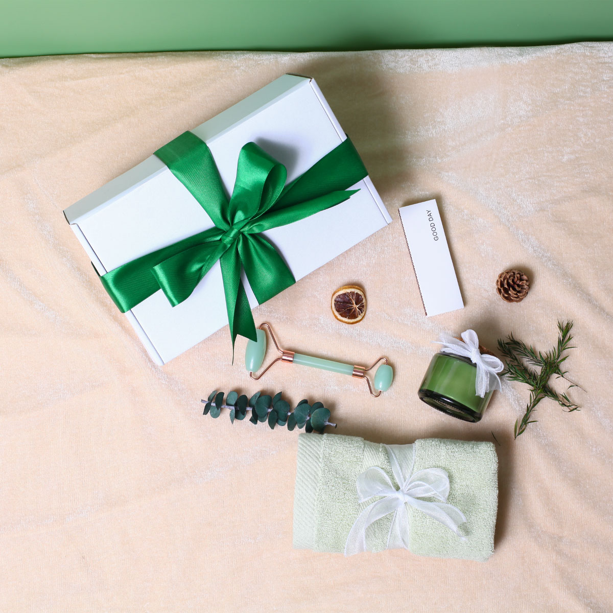 Set quà mang ý nghĩa bình yên, thư thái, hài hòa với thiên nhiên. Set quà giúp chăm sóc bản thân, thư giãn với nến thơm, cây lăn massage, khăn cotton mềm mại và diêm dốt nến, tạo không gian ấm áp, nhẹ nhàng.