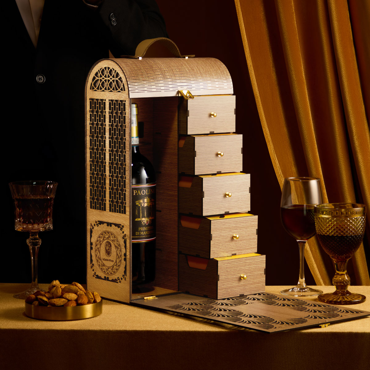 Tuyệt tác gỗ chạm khắc tinh xảo cất giữ bên trong là kho báu của sức khỏe và sự thịnh vượng, khẳng định vị thế độc tôn của chủ nhân với lời chúc một năm mới Xuân Phát Tài, đắc lộc toàn gia, phú quý trọn đời.