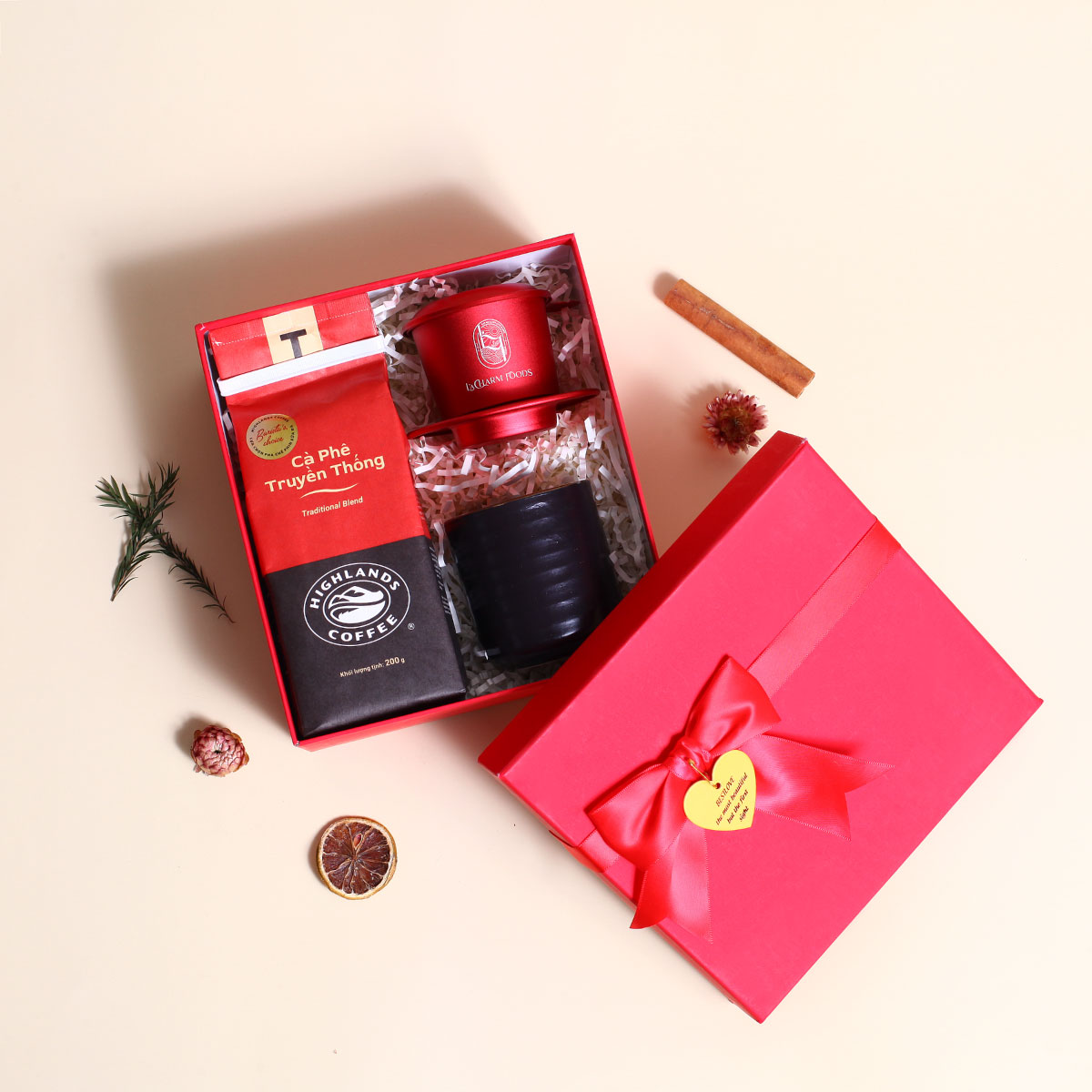 Phin Cà Phê 1 bộ | Coffee Highlands 200g | Ly Gốm Sứ 1 ly | Hộp Quà Cao Cấp và Túi Xách Sang Trọng