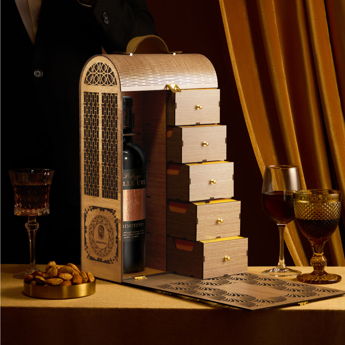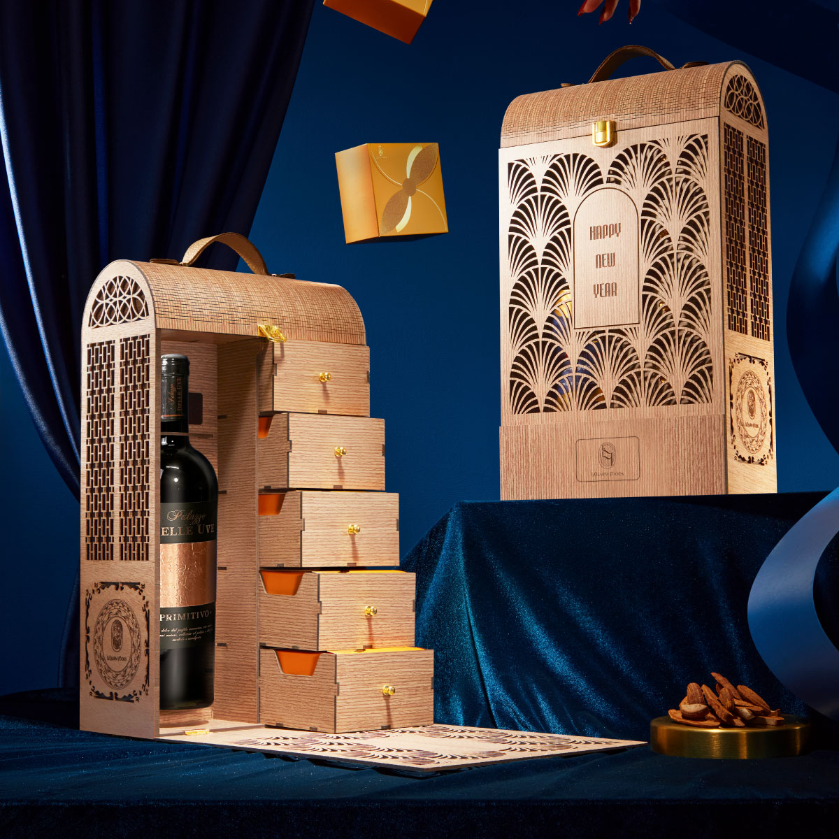 Dáng hộp vòm cao vững chãi với họa tiết điêu khắc tinh xảo tượng trưng cho vị thế vững bền, hòa quyện cùng phong vị Tết đẳng cấp gửi gắm thông điệp Khai Lộc Tân Xuân, công danh rạng rỡ.