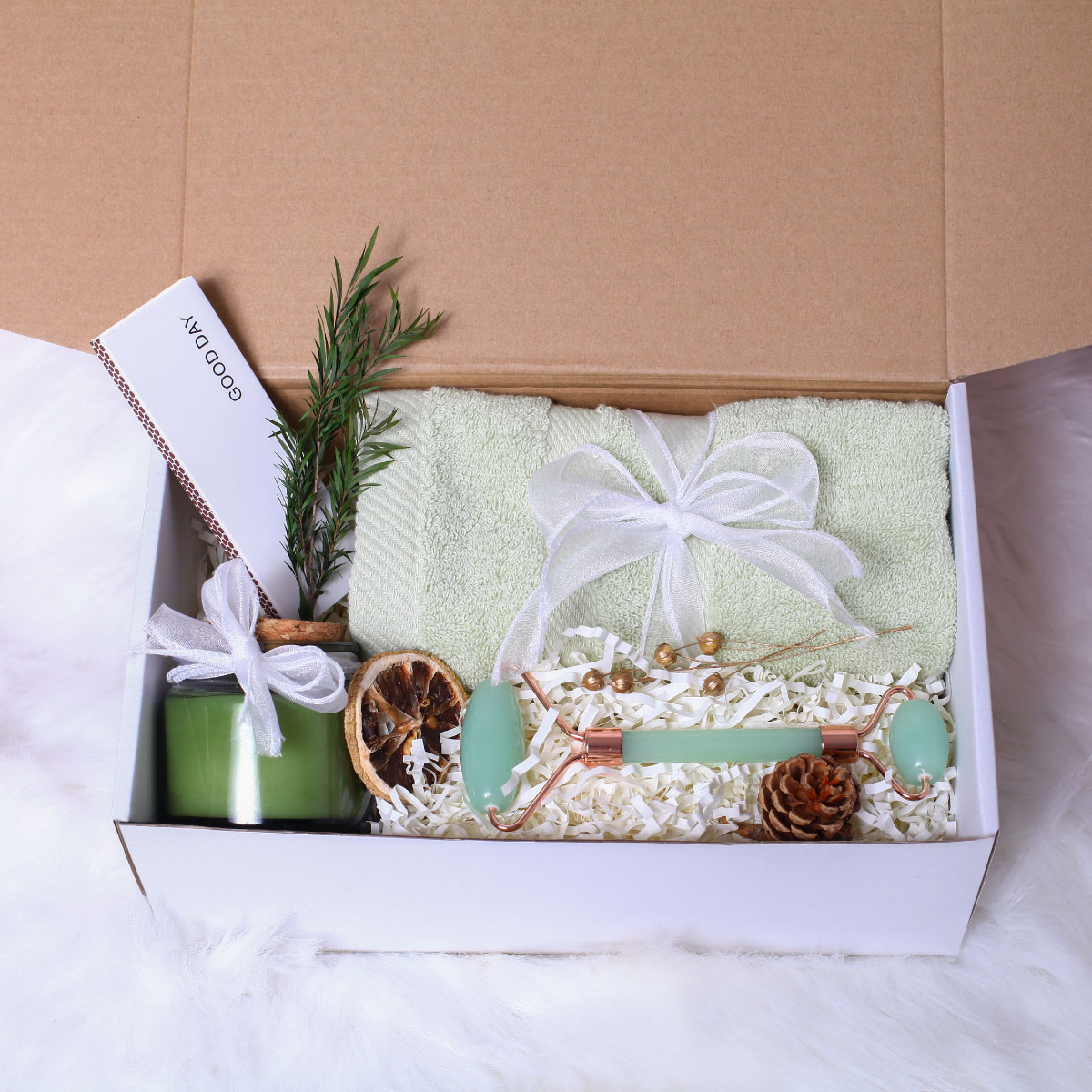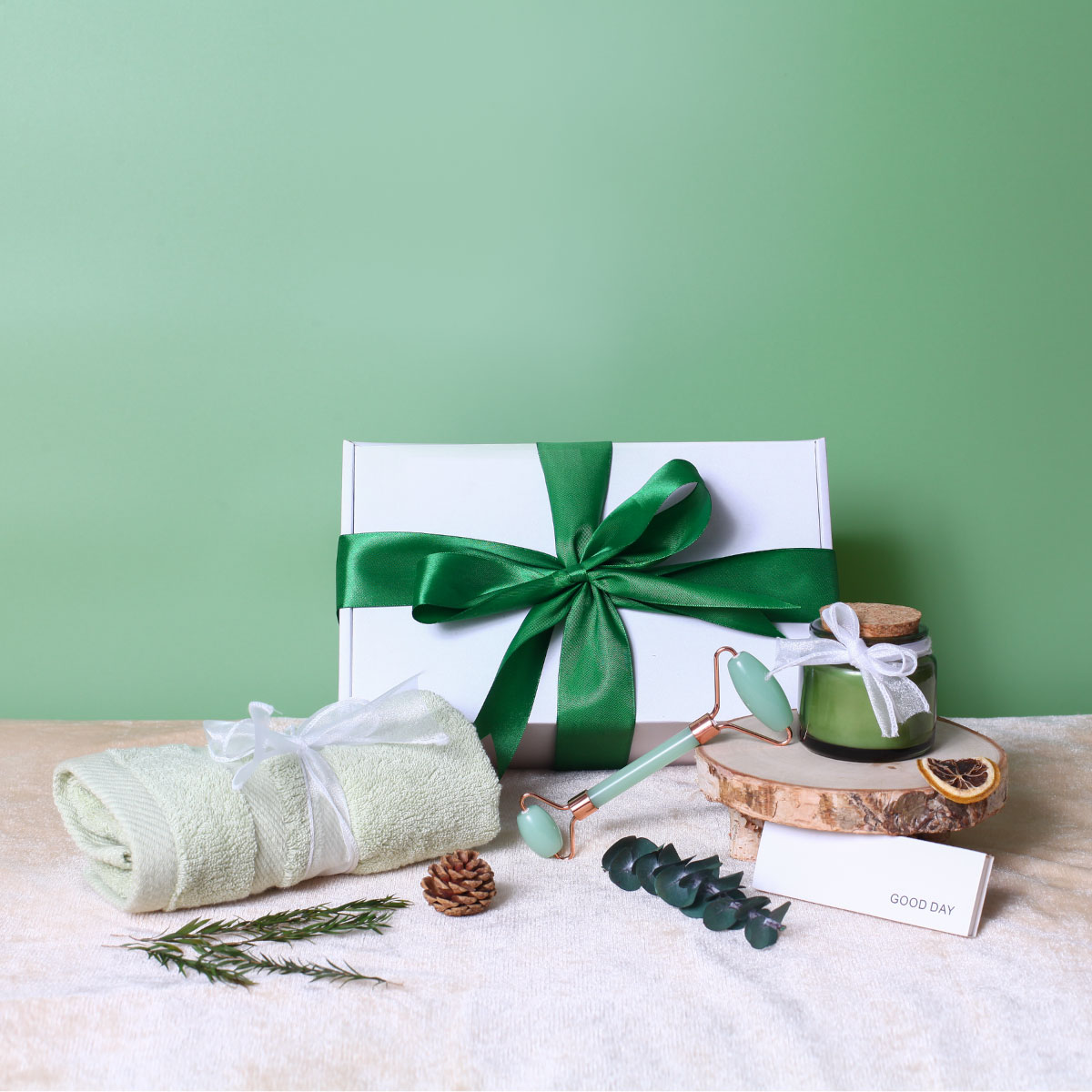 Nến Thơm Mệnh Mộc 100ml | Khăn Mặt Cotton Cao Cấp 30*50cm | Cây Lăn Massage Mặt Đá Guasha | Diêm Đốt Nến 1 Hộp | Hộp Quà Cao Cấp và Túi Xách Sang Trọng